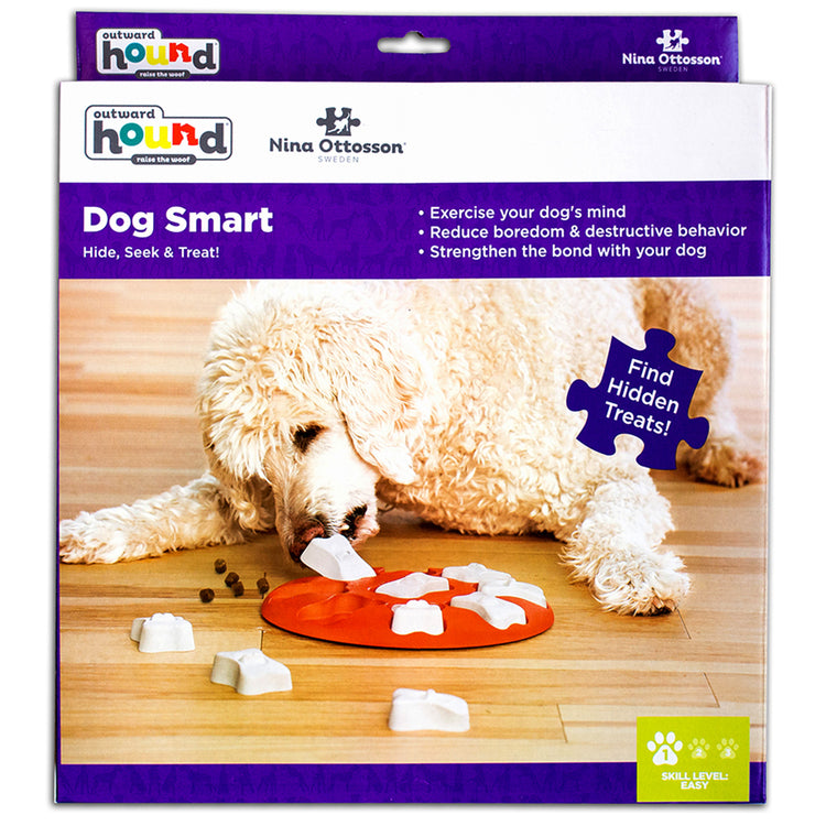 Ett lättanvänt nybörjarspel som lär din hund att leta efter godis genom problemlösning. De benformade pusselbitarna på ovansidan kan läggas på olika sätt för att variera utmaningen. Svårighetsgrad 1, lätt. Storlek: 4cm Storlek: 4cm .