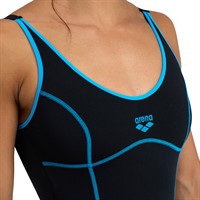 Vår Tania Clip Back-baddräkt passar in i surfertjejstil. Tillverkad av ett svart tekniskt tyg med hög klorförmåga, har denna ena del synliga blå sömmar och trim. Denna träningsdesign kommer med justerbara remmar och en klassisk innerbh så att du kan simma med personlig passform och stöd. Tillverkad av minst 50 % återvunnen polyester från plastflaskor