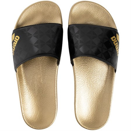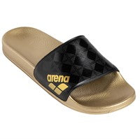 Glid in på vår arena 50:e slide för poolen eller stranden. De är gjorda med en guldformad fotbädd och ett band av vårt 50-årsjubileumstryck med arenalogotypen designad första gången 1973. Det lätta materialet torkar snabbt och är allergivänligt för att säkerställa att dina fötter alltid är bekväma.