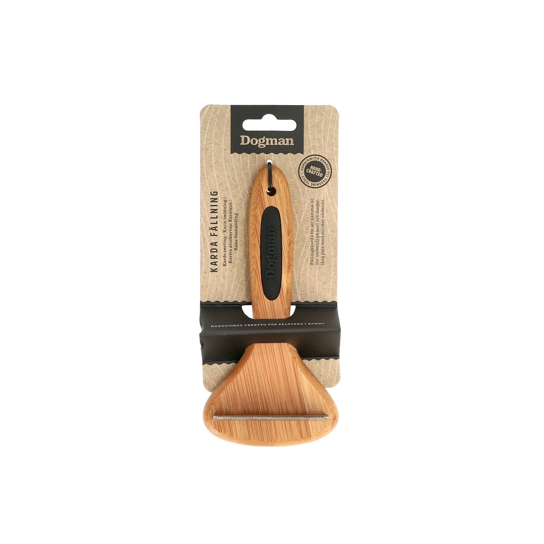 Fällingskarda för att kamma ur lös underull på kort och medellång päls med mycket underull. Kamma bort eventuella tovor ur pälsen för att inte skada pälsens täckhår. Rekommenderas inte på strävhåriga pälsar. Används med mjuka drag i pälsrikningen. .