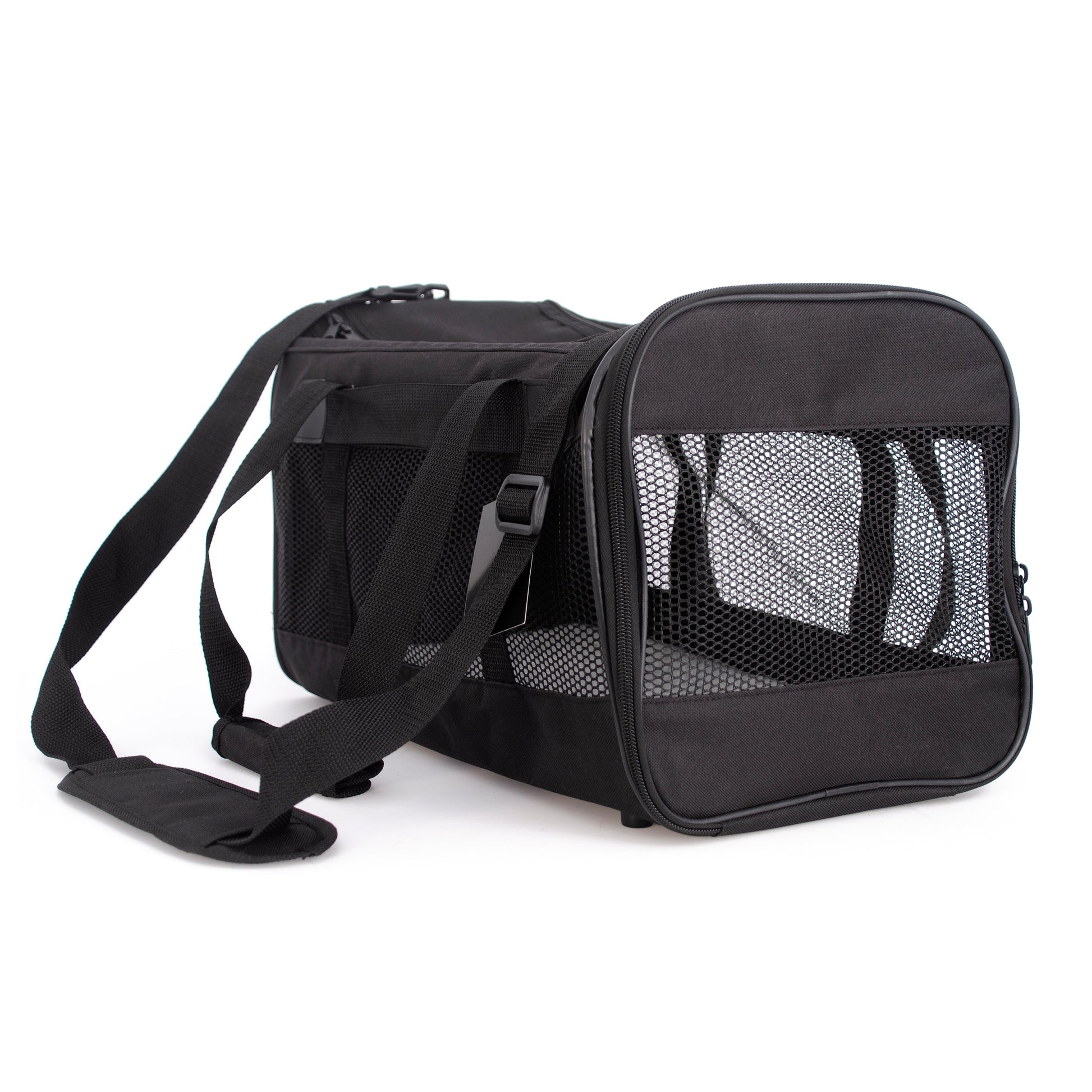 Praktisk väska i basmodell till små hundar och katter. Mesh nät på tre sidor för god ventilation. Öppningar på kortsida och topp. Avtagbar axelrem, mjuk madrass inuti och invändigt koppel att fästa i selen för extra säkerhet. Max totalvikt 8kg. Storlek: 5cm Storlek: 5cm .