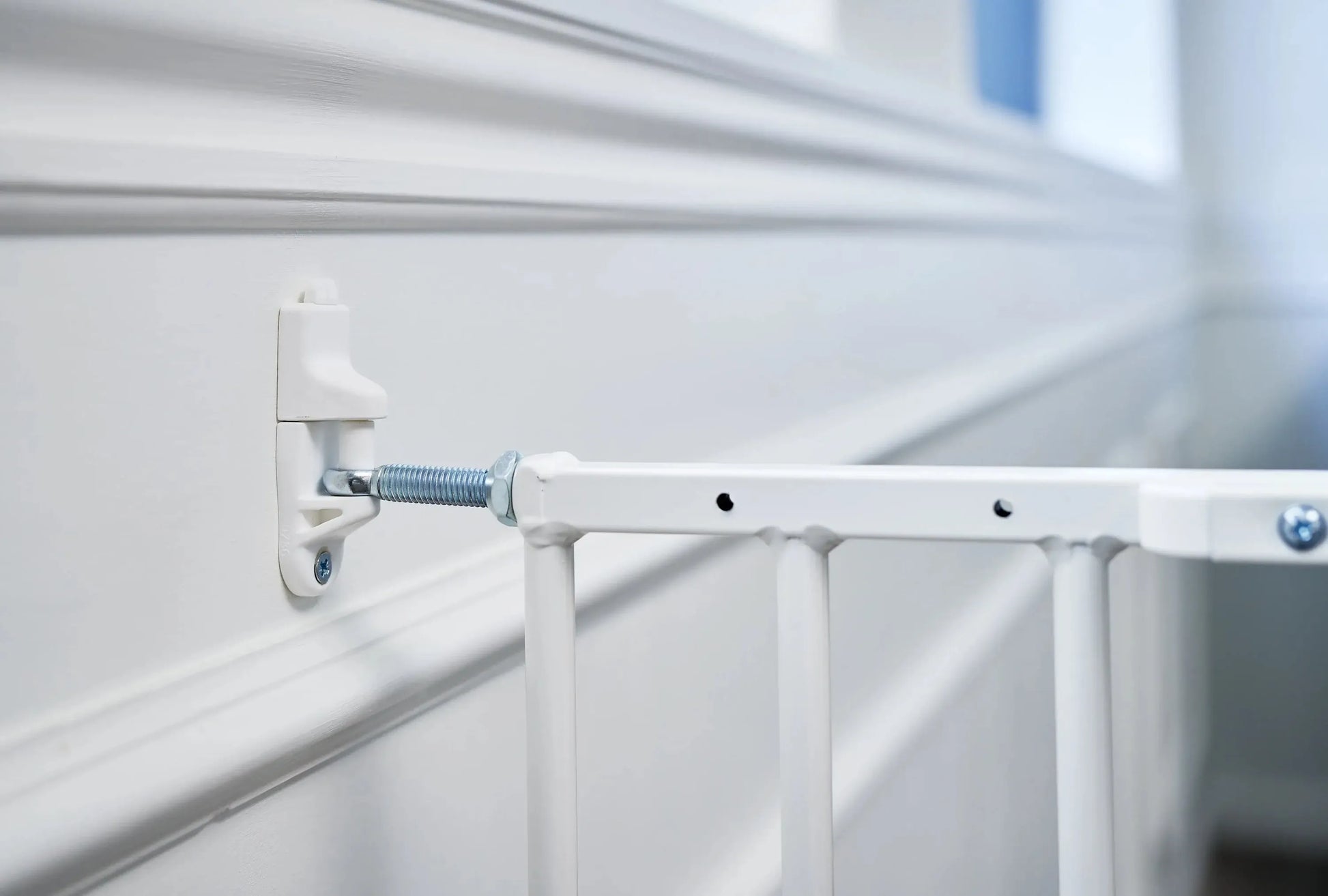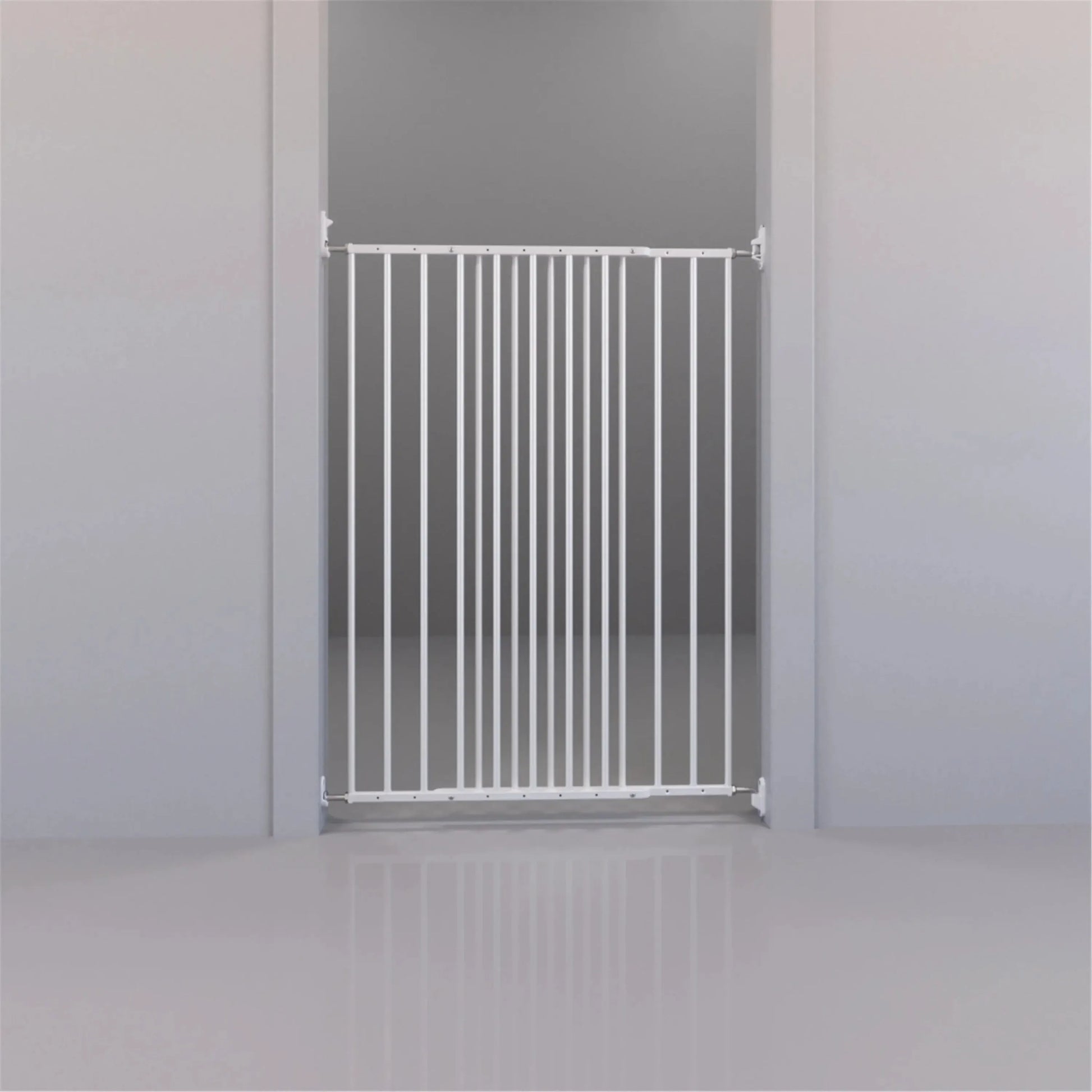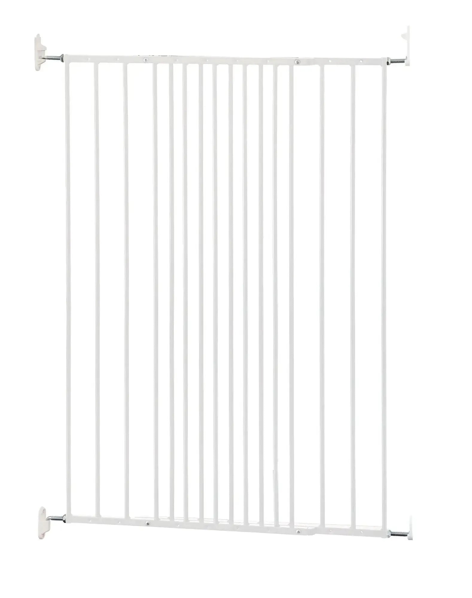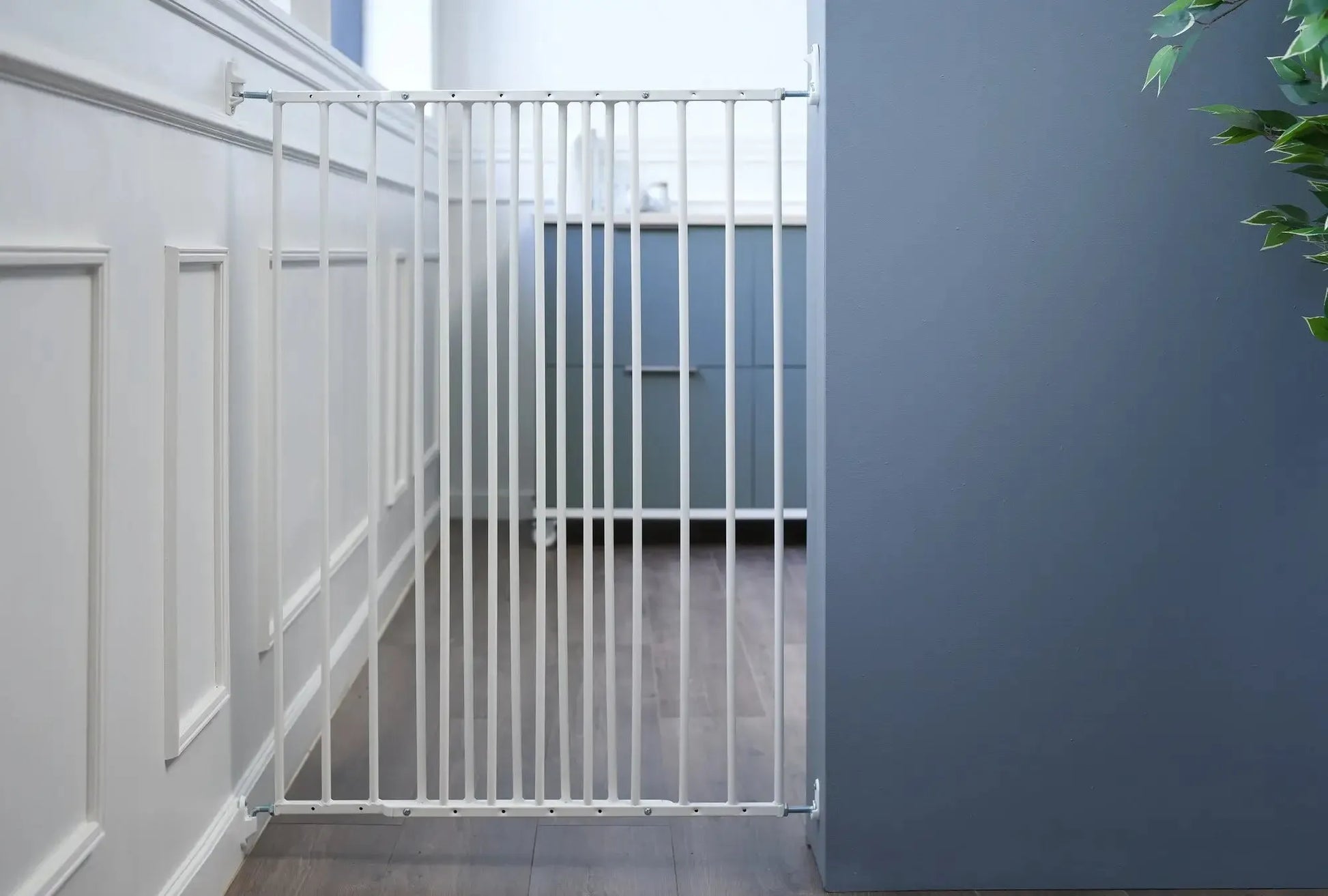 Tillverkad i pulverlackerat stål och PVC-fri plast erbjuder grinden hög hållbarhet och lång livslängd. Med en höjd på 104,5 cm och justerbar bredd på 62,5–106,8 cm passar den i de flesta dörröppningar och gångar.