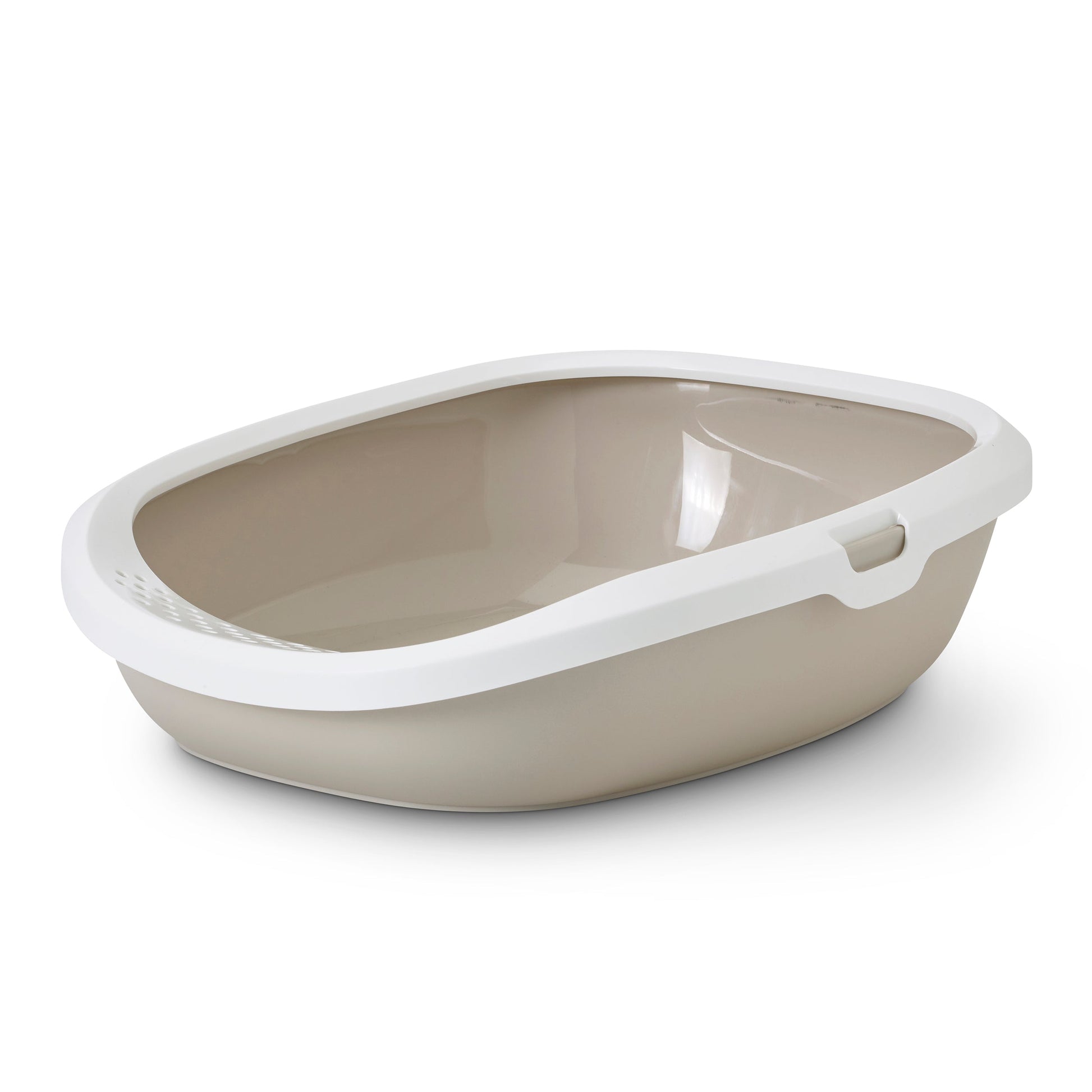 Snygg modern modell med ram. Lågt insteg underlättar för katten. Ramen hjälper till att minska att sand sprätts över kanten på lådan när katten använder den. Ramen kan tas av om man önskar, vilket också underlättar rengöringen. Storlek: 52cm Storlek: 52cm .