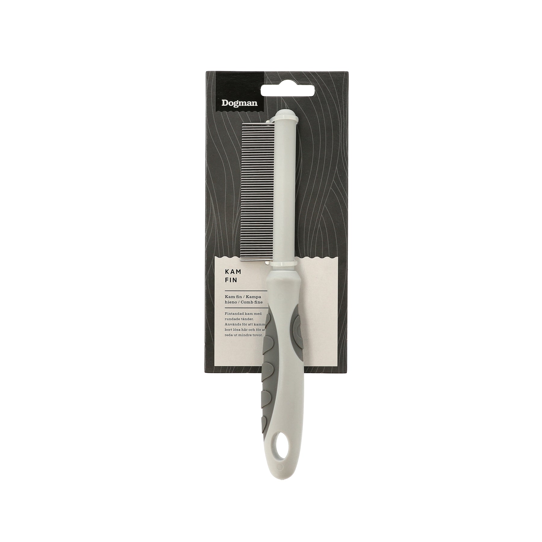 Fintandad kam med rundade tänder. Används för att kamma bort lösa hår och underull samt för att reda ut mindre tovor. De rundande tänder gör kamningen mer skonsam mot huden. .