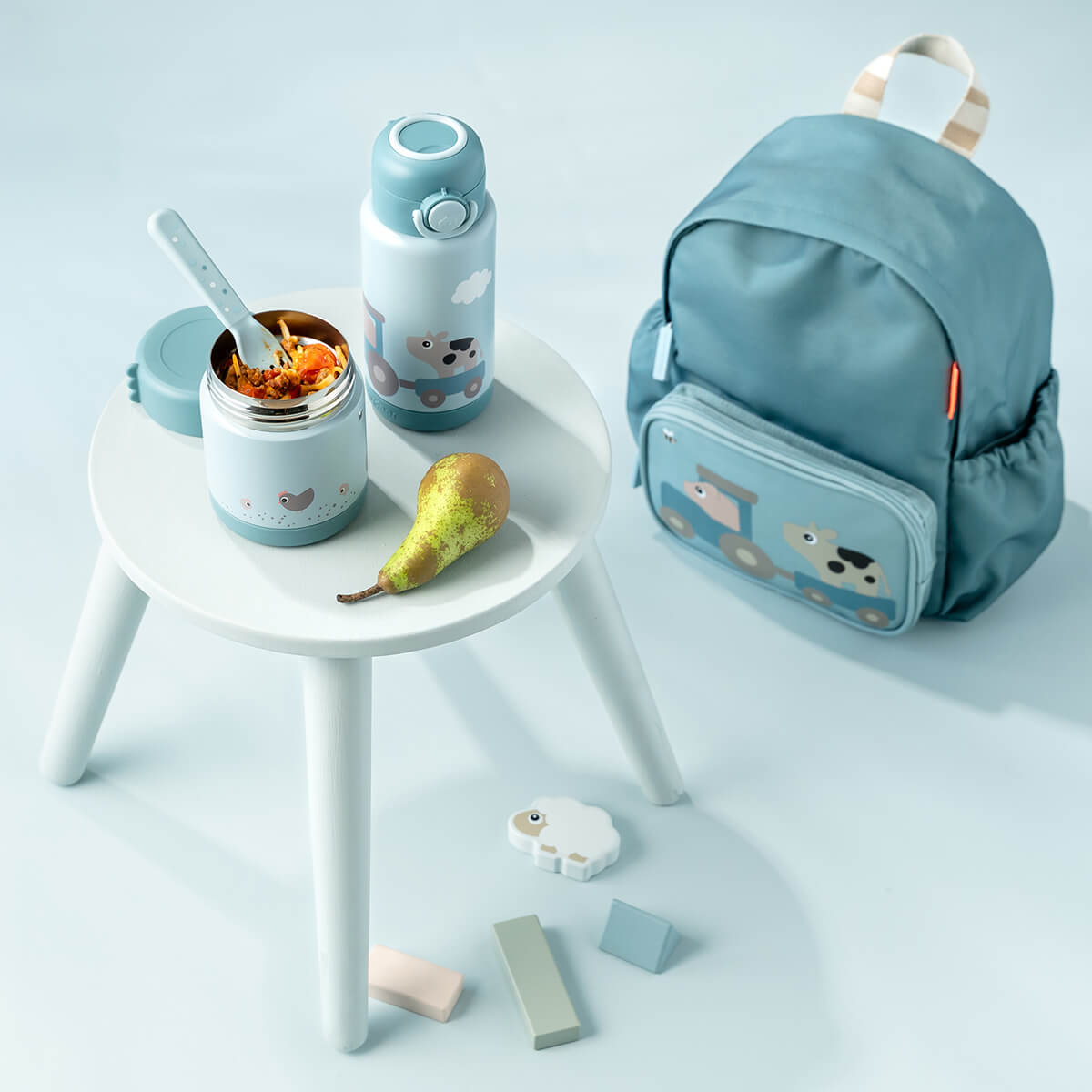 I en vacker blå nyans pryds matburken av de charmiga Dotti och Pigee, som sprider glädje vid varje måltid. En härlig kombination av funktion, kvalitet och lekfull design – skapad för små matälskare på språng.