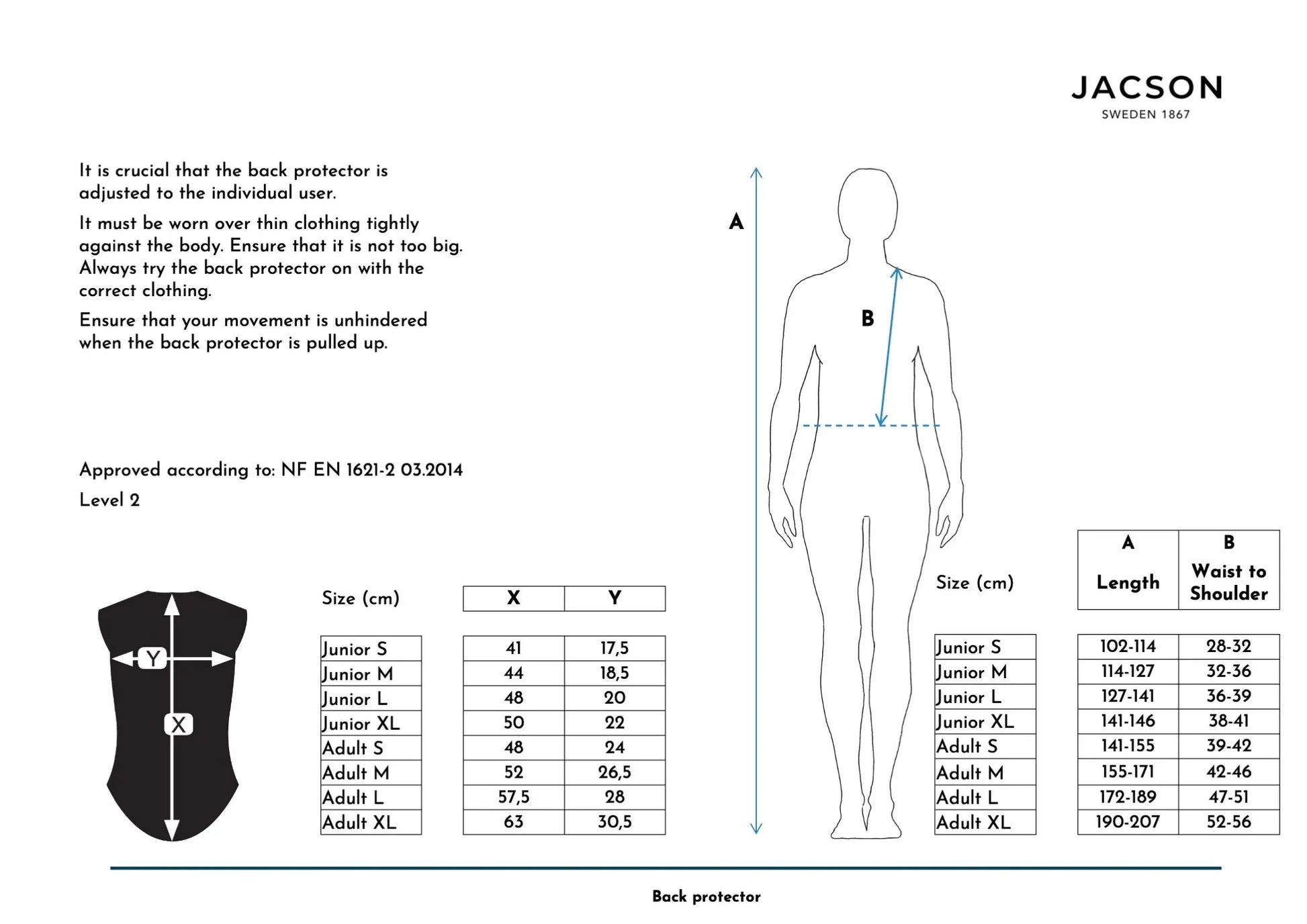 Jacson Rio Ryggskydd Junior – Svart är utvecklat för att ge barn och unga ryttare maximalt skydd och rörelsefrihet i sadeln. Det är CE-märkt enligt europeisk standard NF EN 1621-2:2014, Nivå 2, vilket är den högsta skyddsnivån för ryggskydd. Det innebär att skyddet effektivt absorberar och fördelar kraften vid fall eller stötar, och därmed minskar risken för allvarliga ryggskador.