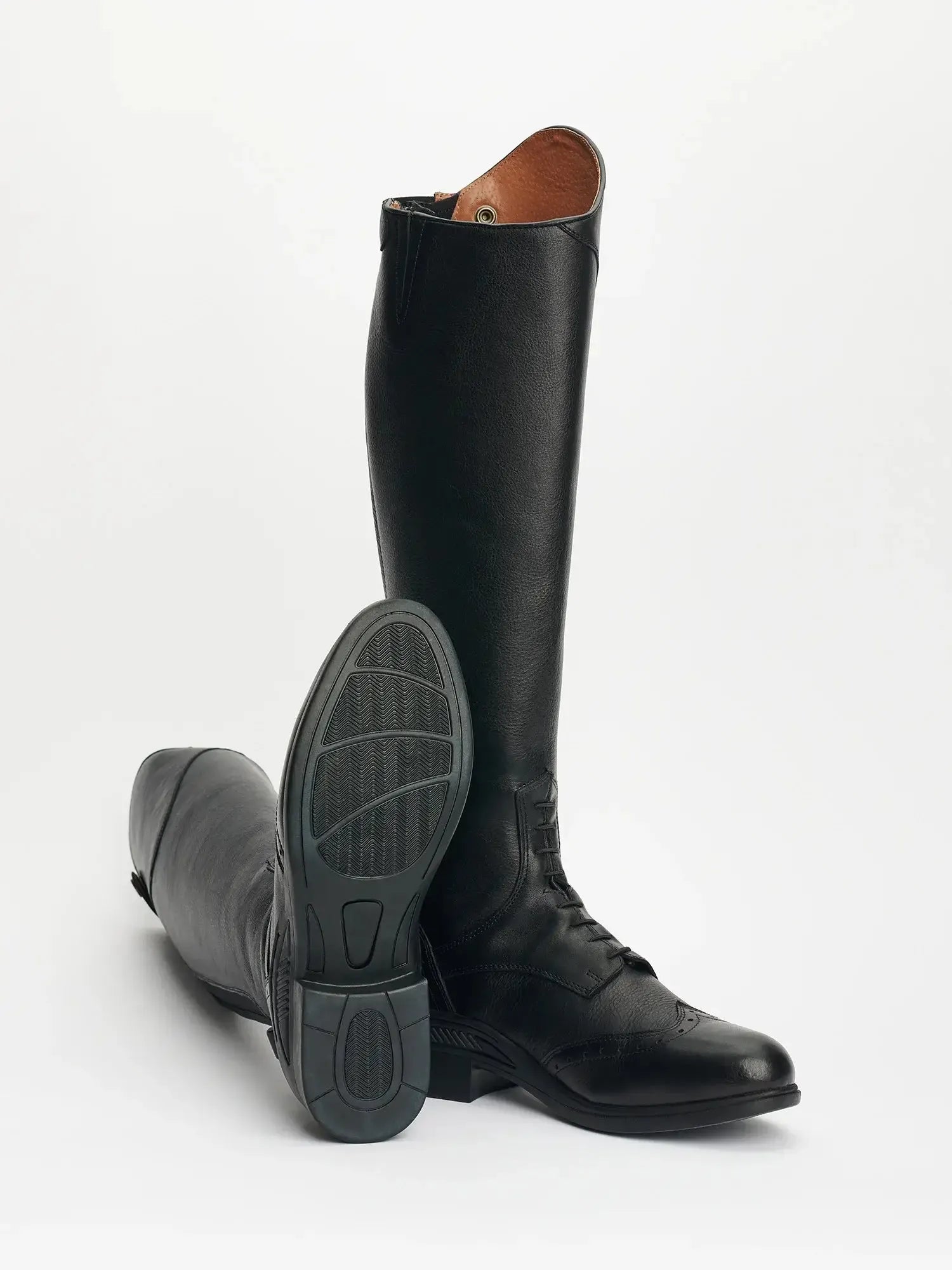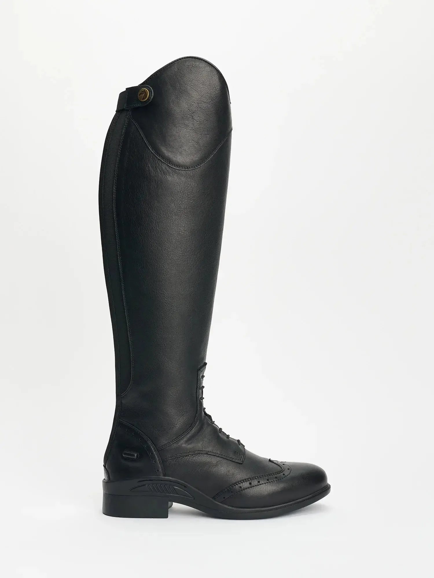 Med elastisk snörning framtill och resår längs dragkedjan anpassar sig stöveln smidigt efter benets form. Den höga skärningen ger en elegant siluett, perfekt både för tävling och vardagsridning. Den slitstarka anti-slip gummisulan ger säkert grepp på alla underlag – från stallgång till ridbana.