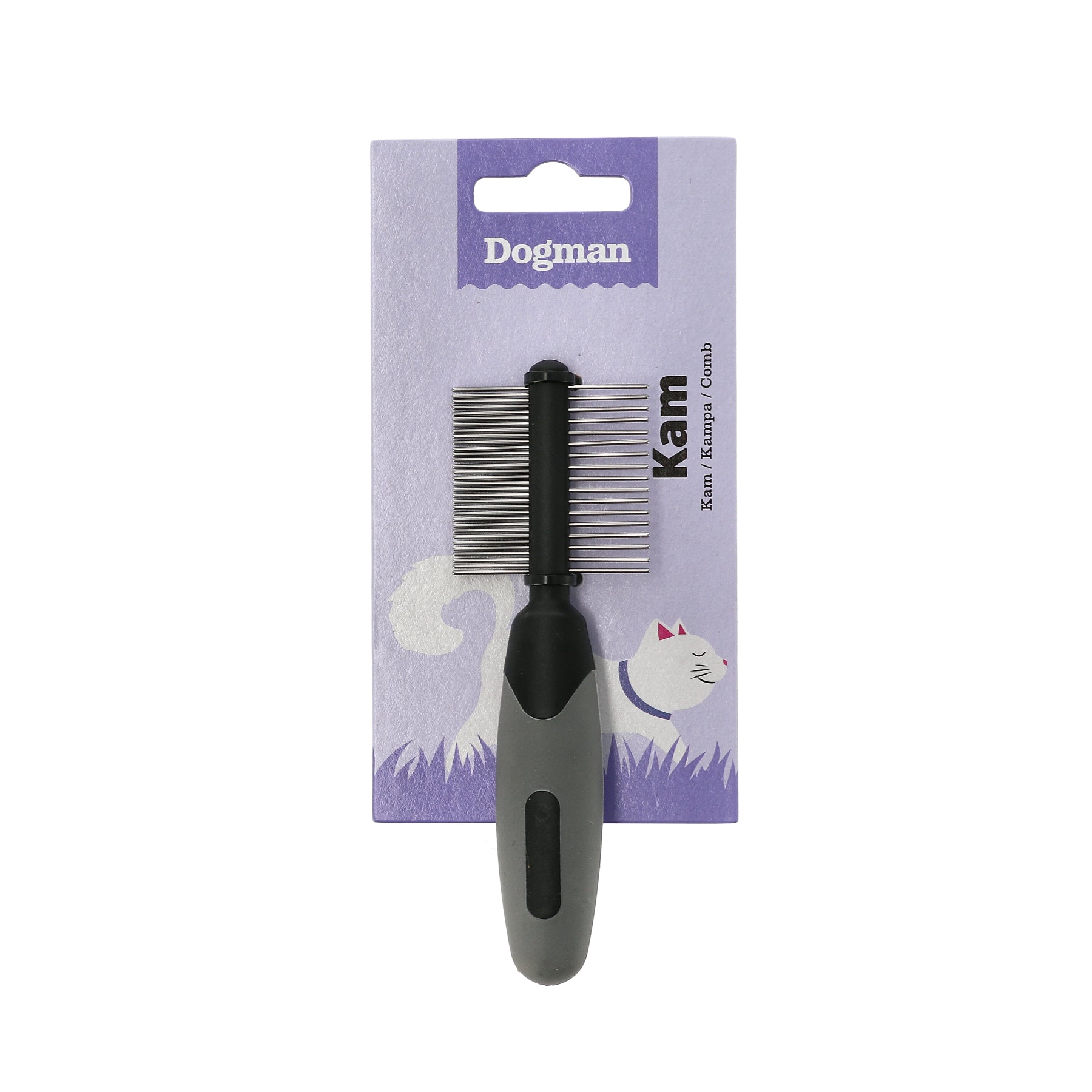 Dubbelsidig kam med gummigrepp och 17 glesa tänder på ena sidan, 32 täta på den andra. Passar även hund och smådjur t. ex. kanin eller marsvin. .