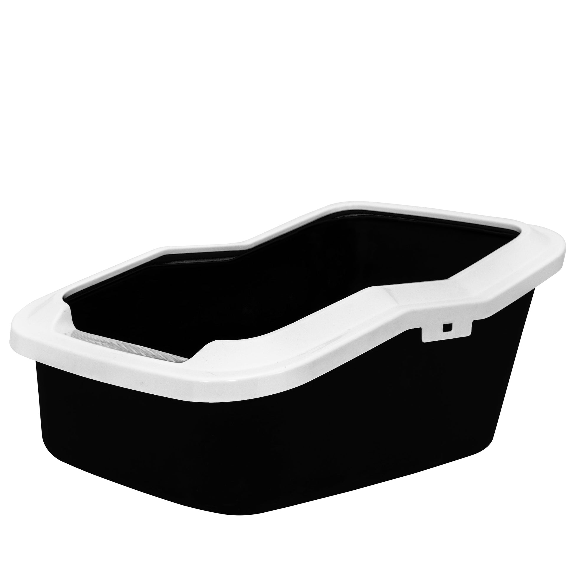 Modern toalåda i plast med ram. Ramen undviker att sand sprätts över kanten på lådan när katten använder den, och kan tas av för enkel rengöring. Extrahög i bakkant, 26cm, för att hindra hankatter från att kissa utanför lådan. 13cm i framkant. .