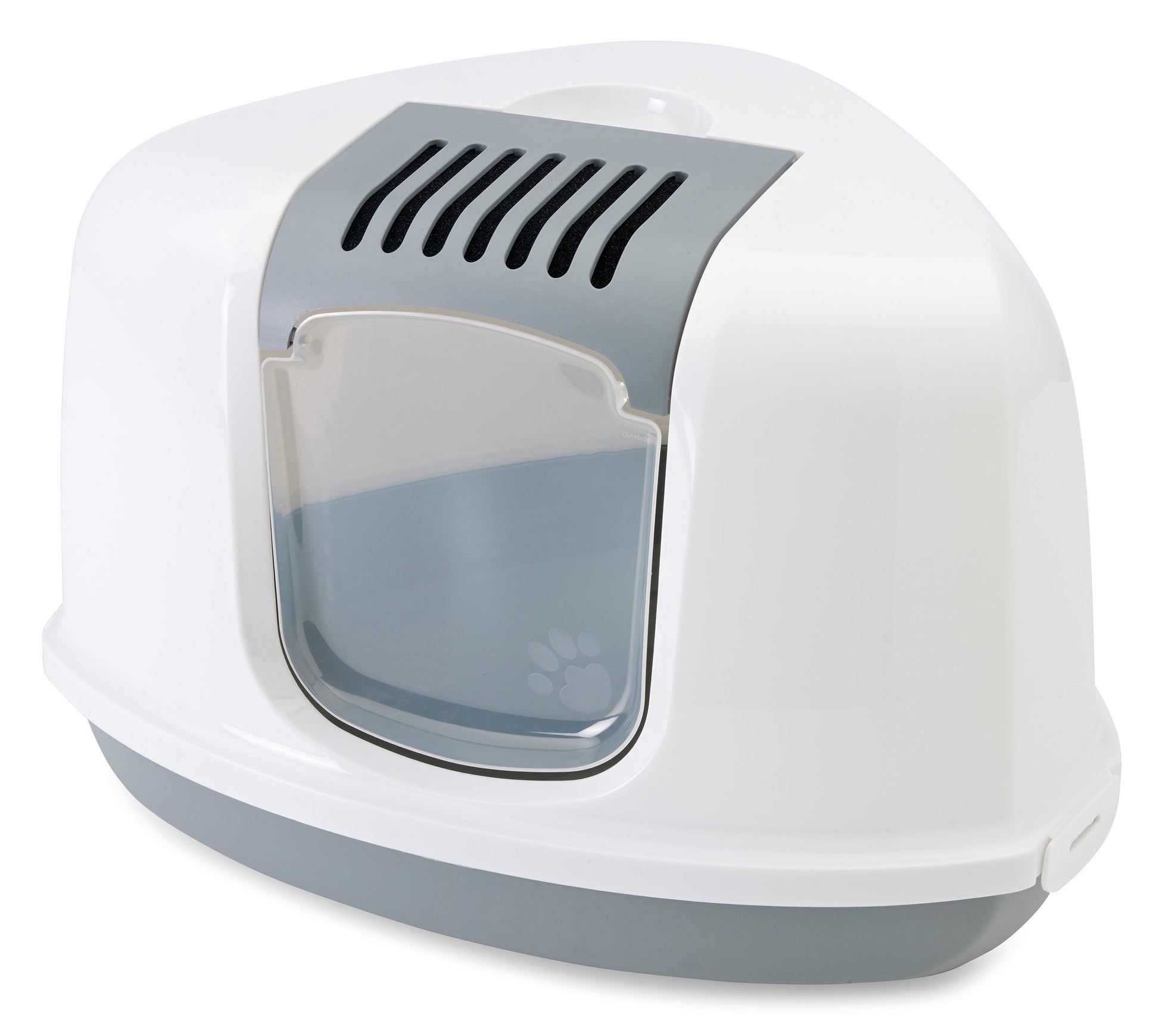 Platsbesparande hörntoalett m tak som är lätt att rengöra. Med inbyggt handtag, öppningsbar front, plastlucka och filter med aktivt kol som minskar att dålig lukt och damm sprider sig från kattlådan. Perfekt för hörn! .