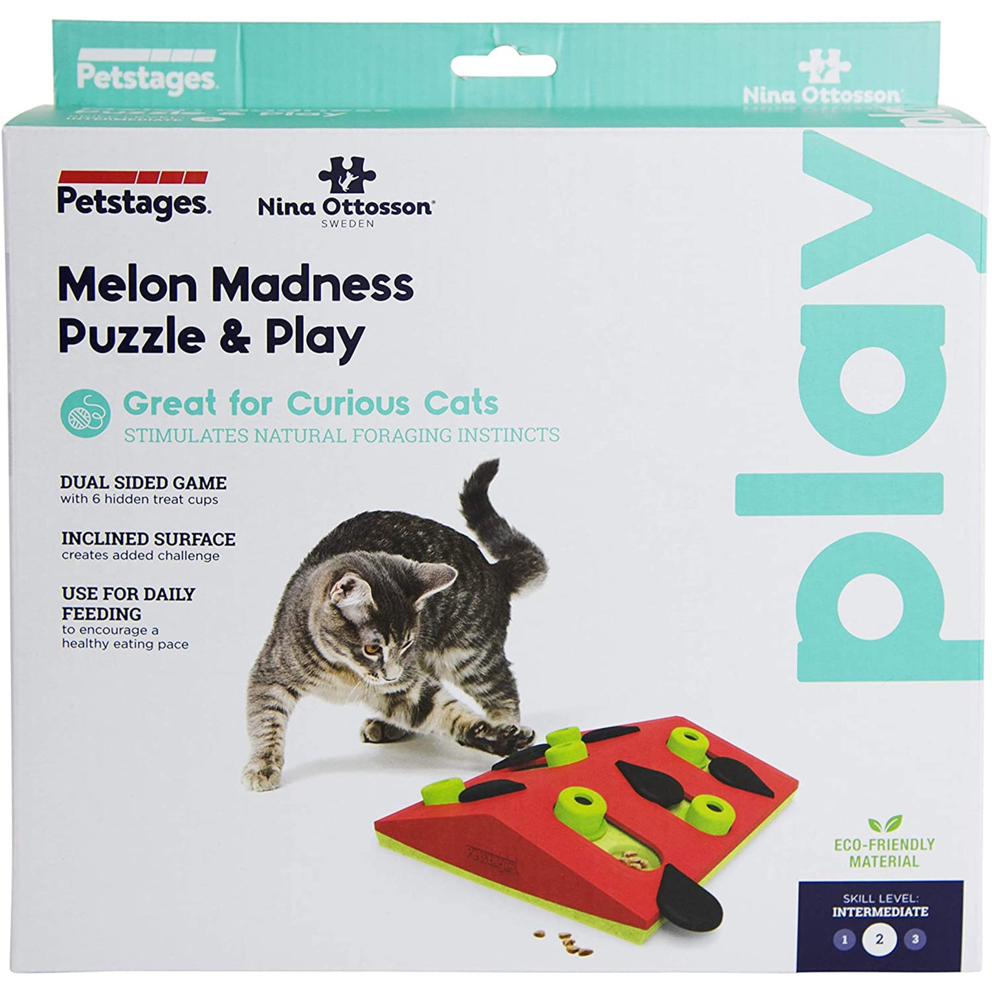 Katten skjuter på klossarna och vrider på de svarta bitarna för att hitta godis i de 6 godisgömmorna och inuti de 6 klossarna. Spelet kan anpassas för att göra det lättare för nybörjare eller mer utmanande för smarta katter. .