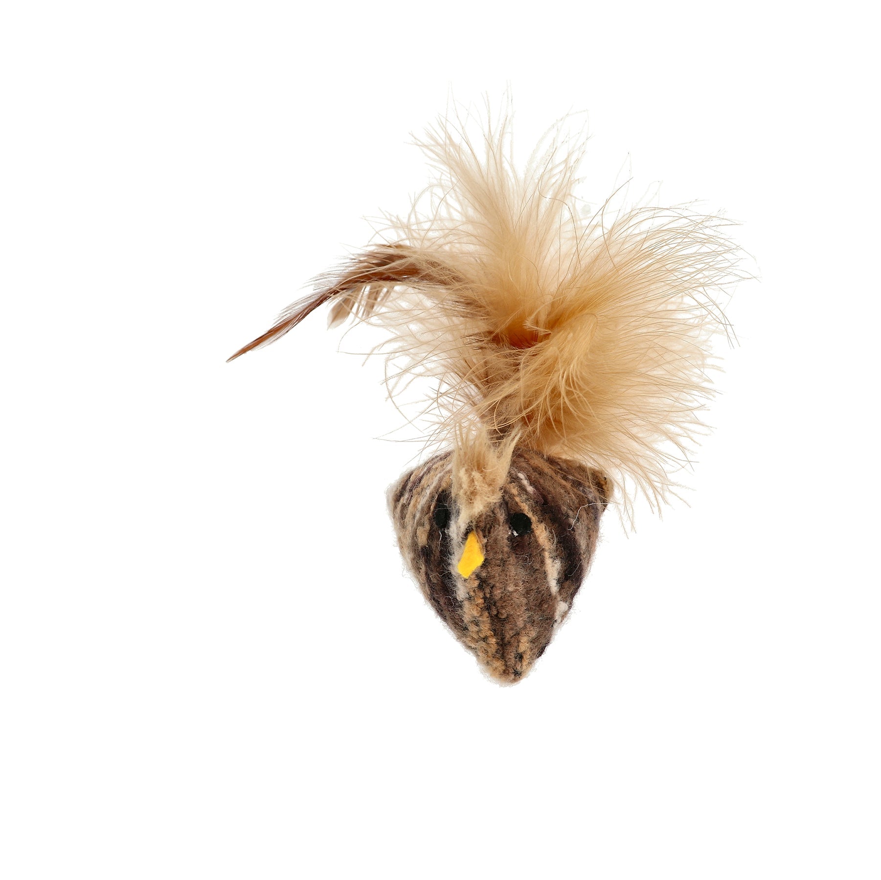 Gullig liten trekantig kyckling med fjädrar. Leksaken innehåller kattmynta. Storlek: 2cm Storlek: 2cm .