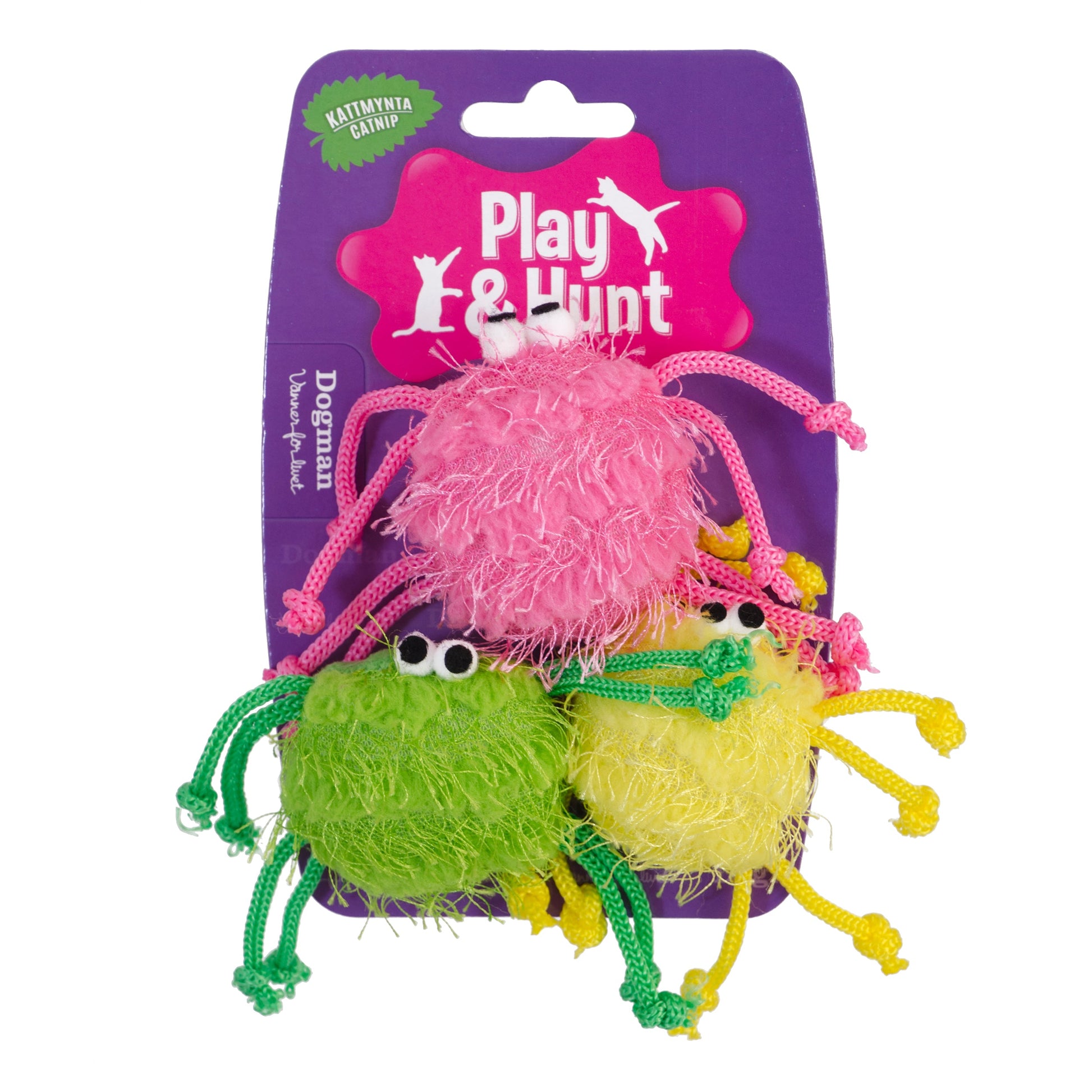 Färgglada spindlar av mjuk plysch i olika färger. Storlek ca 5cm. Rolig leksak för din katt som lockar till bus och lek. Stimulerar dessutom kattens naturliga instinkter. Rekommenderas inte för kattungar. Storlek: 5cm Storlek: 5cm .