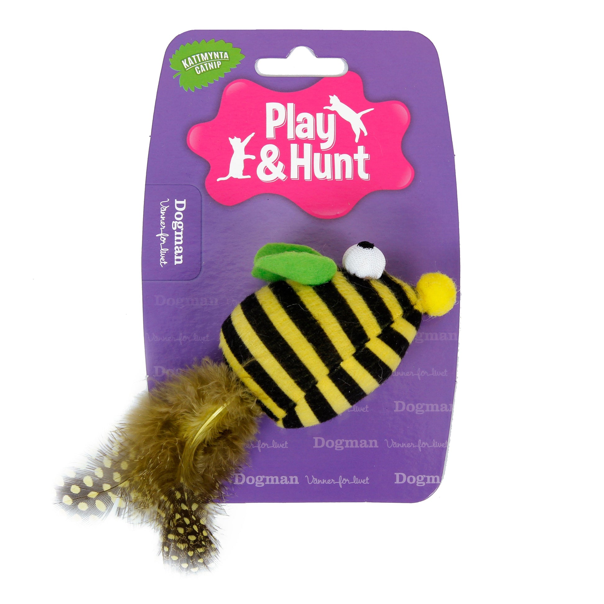 Leksaken är svart och gul med en fjädersvans. Perfekt att smyga på och jaga efter. Lek är roligast tillsammans och ett utmärkt sätt att stärka bandet mellan dig och din katt. Med kattmynta/catnip och fjädrar. Storlek: 14cm Storlek: 14cm .