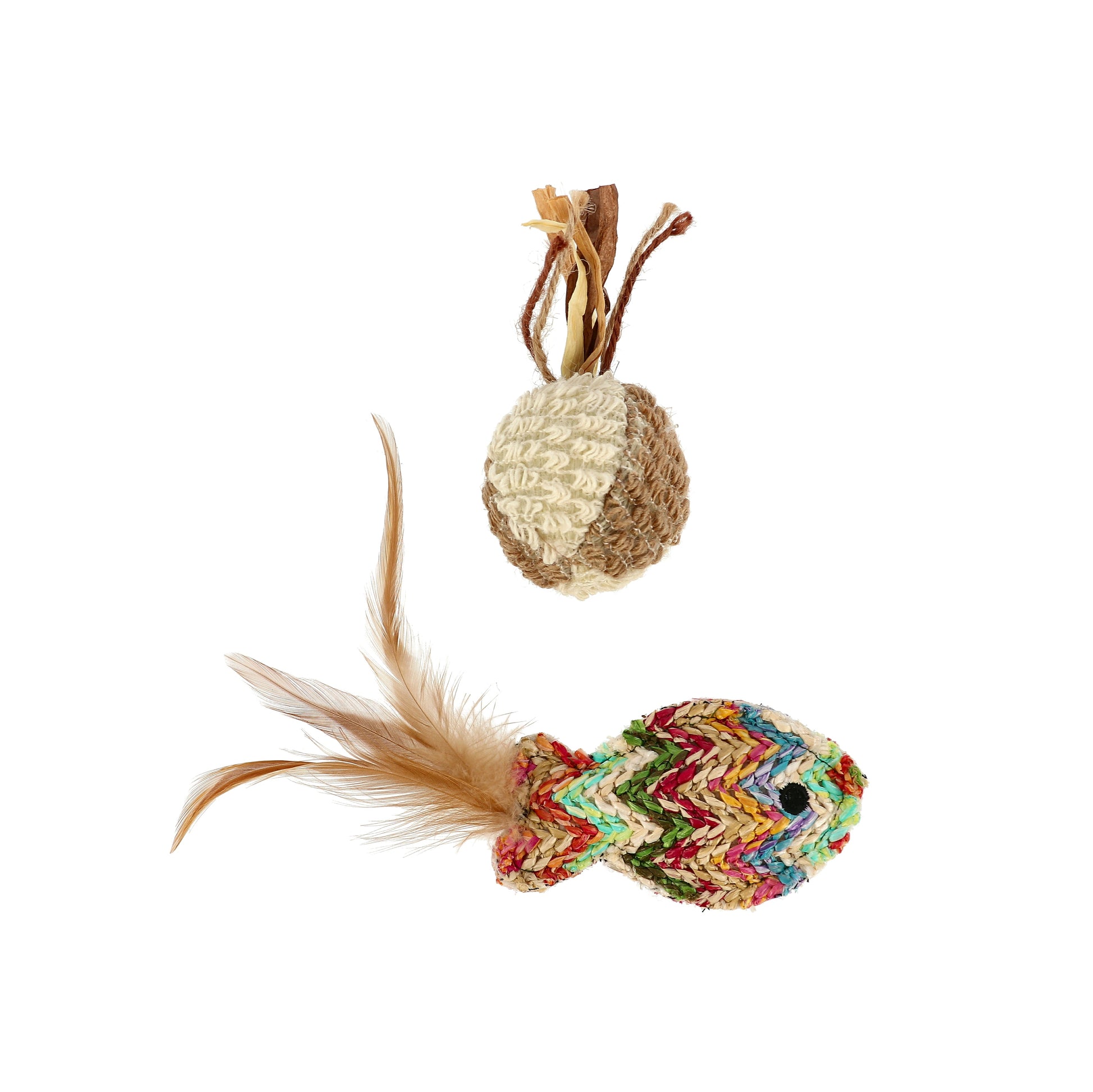 Färglad fisk i grov twillväv och en neutral boll. Båda innehåller Kattmynta. Storlek: 5cm Storlek: 5cm .