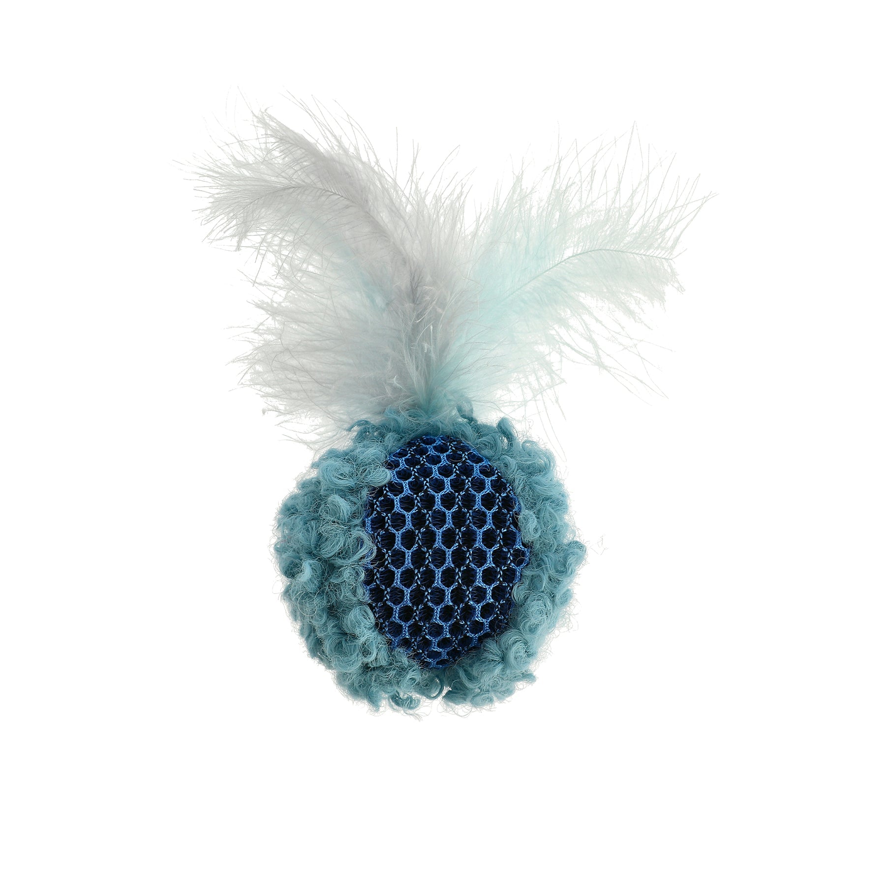 Boll av mesh- och lurvigt tyg. Fjäder på toppen. Innehåller kattmynta. Storlek: 5cm Storlek: 5cm .