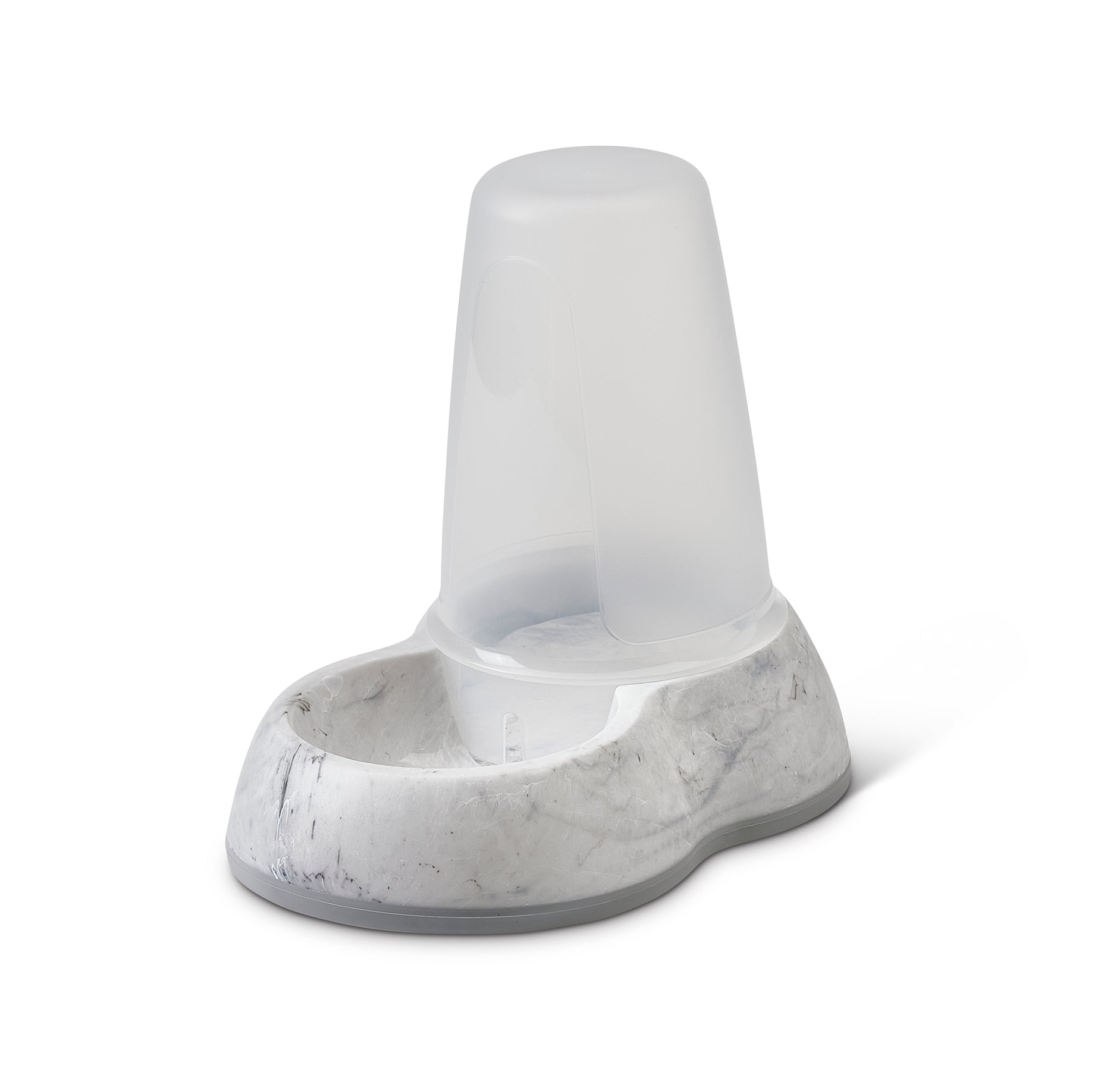 En modern vattenautomat som ger hunden eller katten friskt vatten när den är törstig. Vattenbehållaren är transparent och gör det enkelt för dig att se när du behöver fylla på vatten. Skålen har integrerad gummibotten för att stå stabilt. .