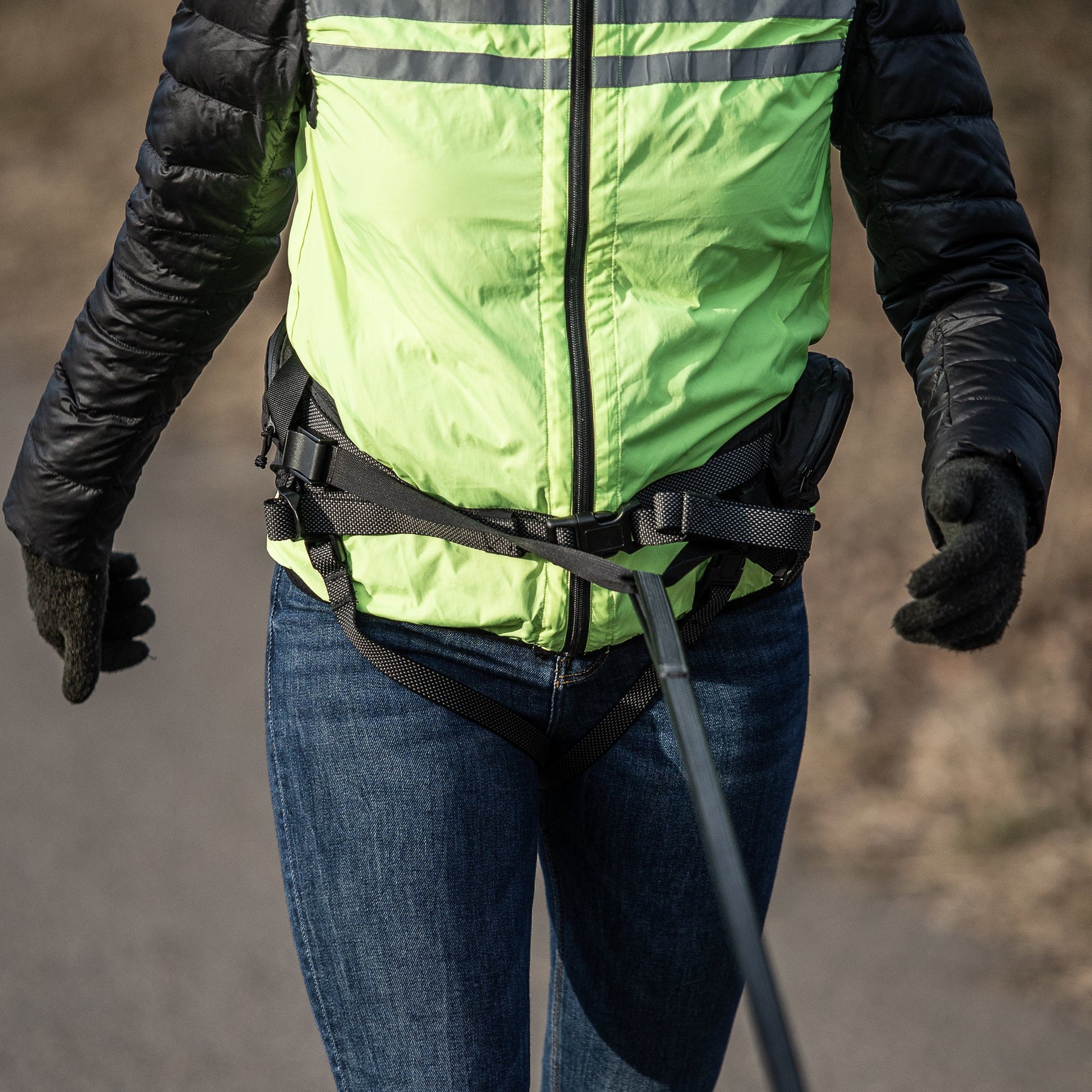 Midjebältet har en vattenflaskhållare samt två fickor - den ena med en smidig öppning för bajspåsar. Remmar mellan benen för att hindra bältet från att glida upp. Kopplet fäster du i ett band med snabblås för att enkelt kunna koppla loss vid behov. .