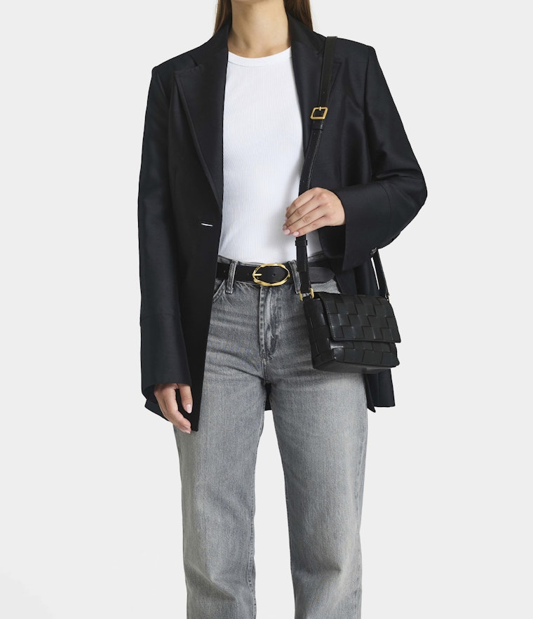 Den justerbara axelremmen i läder kan ställas mellan 100–131 cm, vilket gör att väskan kan bäras både crossbody eller över axeln.