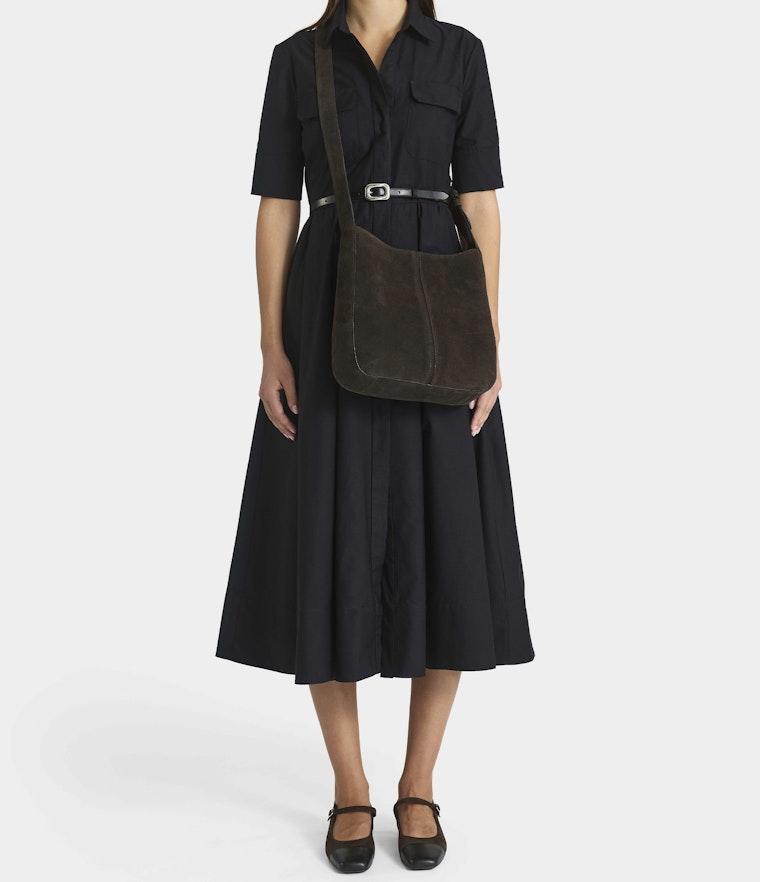 Den rena, avskalade formen lyfts av en lång ändtipp – en subtil detalj som ger väskan ett unikt uttryck. Blank silverfärgad hårdvara förstärker den moderna och exklusiva känslan.
