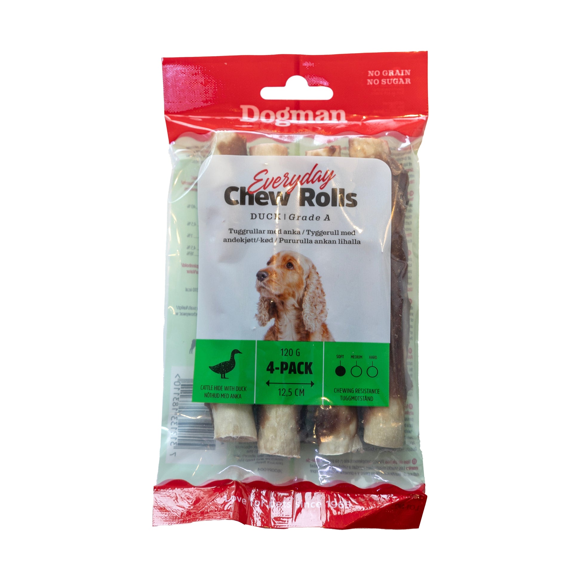 Tuggrullar med smaskig anka. Lätta att tugga och passar därför perfekt till hundar som behöver mindre tuggmotstånd. Ger sysselsättning och tillgodoser tuggbehovet. Håll alltid hunden under uppsikt när den tuggar på tuggben. Med Grade A-anka. Storlek: 5cm Storlek: 5cm .